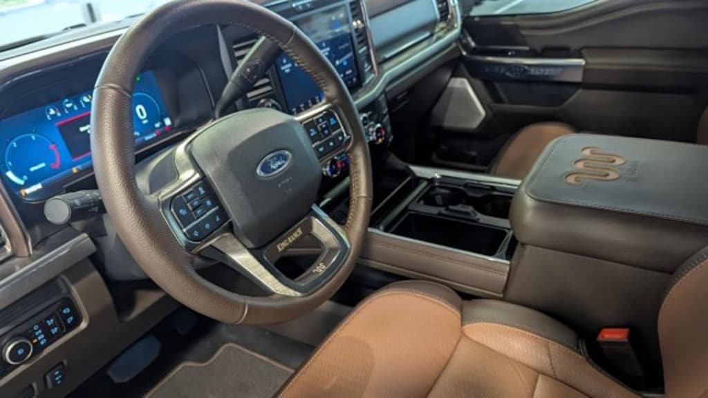 Voice Activated Dual Zone Front Automatic Air Conditioning w/Steering Wheel Controls, Urethane Gear Shifter Material, Unique King Ranch Leather 40/Console/40 Seats -inc: multi-contour Kingsville Antique Affect leather seating surfaces, dual integrated cupholders in armrest, 2 outboard head restraints, heated/ventilated seating, 8-way power driver and passenger seat (4-way power-adjustable track, 2-way power recline and 2-way power lumbar), 2-way adjustable driver/passenger headrests and easy entry driver's seat w/memory, Trip Computer, Transmission: TorqShift-G 10-Speed Automatic -inc: SelectShift and selectable drive modes: normal, eco, slippery roads, tow/haul and off-road, Transmission w/Driver Selectable Mode and Oil Cooler, Trailer Wiring Harness, Tires: LT275/65Rx20E BSW A/T -inc: Spare may not be the same as road tire, Tire Specific Low Tire Pressure Warning, Tailgate/Rear Door Lock Included w/Power Door Locks.